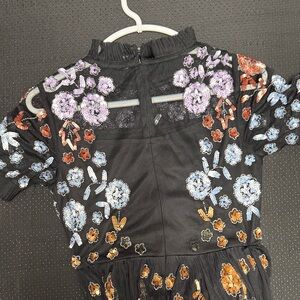 This elegant black formal dress features a stunning floral design, perfect for special occasions. The intricate sequence adds a touch of sophistication. Bridesmaid, prom, formal occasion