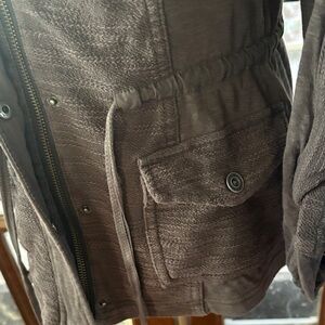 Stylish utility jacket from Saturday Sunday by Anthropologie. Textured fabric, zip and snap front closure, functional drawstring waistline, pockets at hip