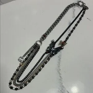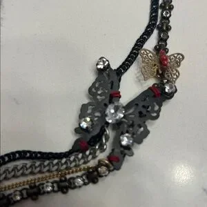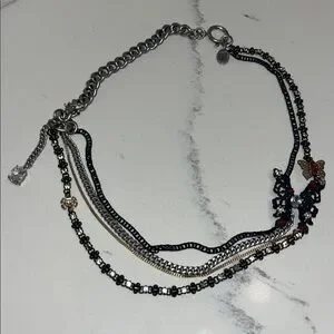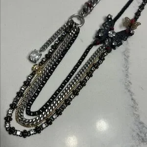 Juicy Couture Butterfly Necklace. Stunning and unique! Gorgeous multi colored and mixed strands draping down from butterfly’s and crystal accents. Oversized clasp with the signature crown charm tag. Great condition and like new. Much cuter in person! Drapes 10 inches from the clasp, 20 inches total length.