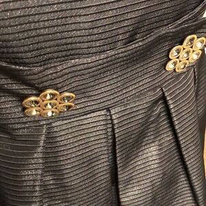 This beautiful Nanette Lepore cocktail dress is made out of a acrylic material and comes in a black color / striped pattern. Styling includes a cocktail style with surplice/scoop neckline. Cap Sleeve. Gold Crystal medallion detail at the banded waist. Hidden back zip. Truly a gorgeous Nanette Lepore cocktail dress! Gently used and guaranteed to make an excellent addition to your contemporary wardrobe!