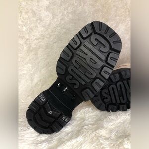 Stylish cream Mary Jane platforms. Features a bold buckle and chunky sole. Animal print detail