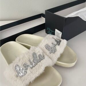 White Pearl plush bedazzled BRIDE slides