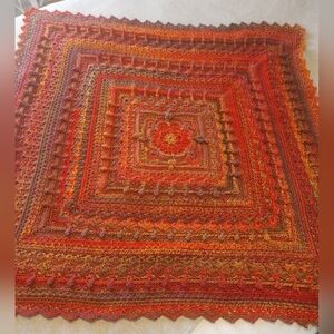 60% Acrylic 40% Polyester soft heavyweight baby/lap blanket, about 44" across, square. Autumn Coloring-it was so hard to get the correct coloring to show up on camera. It's so much prettier in person. Best representation of coloring is perhaps the first or final photo of the yarn. If you would like a photo in the sunshine, I could try for you.