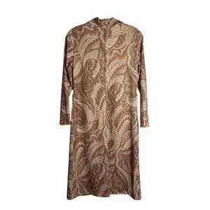 This vintage Walden Classics dress features a paisley design in earthy tones. Its cowl neck adds a touch of sophistication, while the 3/4 - long sleeves provide practical elegance. Crafted from polyester of it's time, ensures durability and comfort. The mid-length silhouette and timeless print make it an ideal choice for creating a nostalgic, yet chic look.
