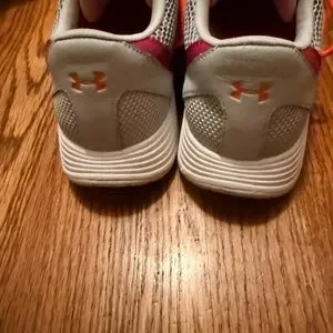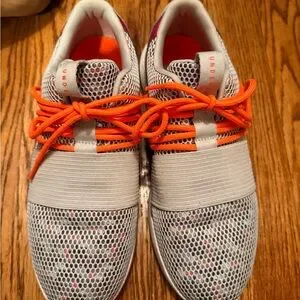 Stylish athletic shoes with vibrant orange laces. Breathable gray mesh upper. Ideal for sports and workouts.