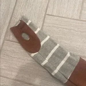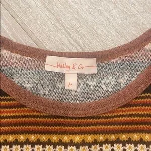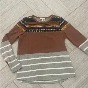 Stylish long sleeve top with a colorful pattern. Features brown, gray, and black with hints of yellow and white. Perfect for casual wear. Soft sweater material, size medium.