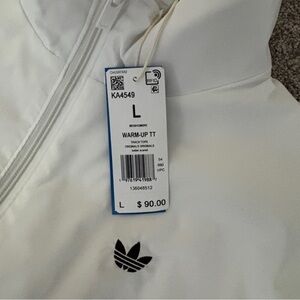 Stylish Adidas track jacket in red and white. Features stripes and logo. NWT
