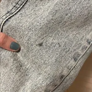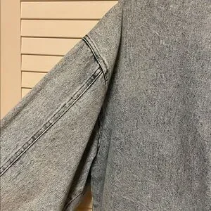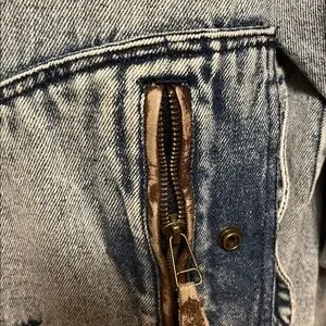 Stylish denim jacket with unique pocket design. Ideal for everyday wear. Very 1980’s!!!! Zippered pockets, bomber style, this jacket has it all!! One tiny spot on back of sleeve. Armpit to armpit is 26 inches. Total length is 27 inches. All you need is a mullet!!!