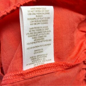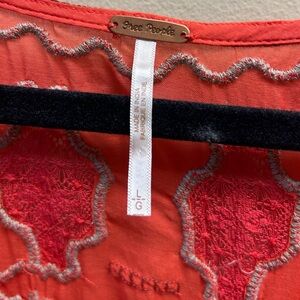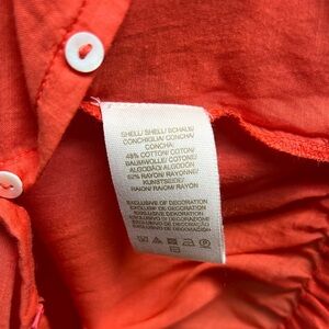 Bright coral blouse with intricate embroidery and functional buttons. Features three-quarter sleeves. Call out: tiny hole on sleeve. Please see photo.