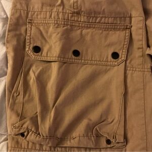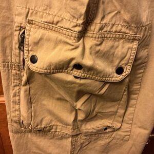 Classic khaki cargo pants with multiple pockets, seven . Ideal for casual wear. Two back pockets with flap covered 6x6. Two front deep side pockets 12 x6. Right leg cargo pocket with three snap closure is 9x8. Left leg cargo pocket has three snaps and a side zipper pocket. No tag, but never worn. Front close -zipper with red accent and button. On front accent stitching across thigh and below knee.
