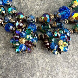1960s triple strand jewel tone beaded necklace with matching clip on earrings