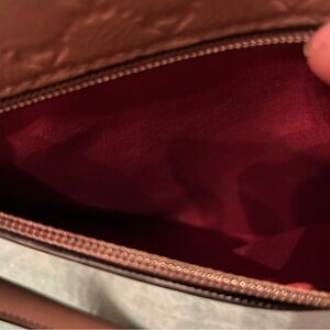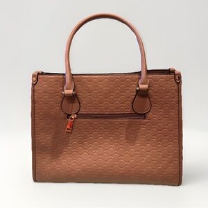This elegant brown tote bag features a stylish design with a distinctive bee emblem. Perfect for any occasion, it combines fashion and functionality. Two snap closures and a zippered center. One zippered pocket on exterior.