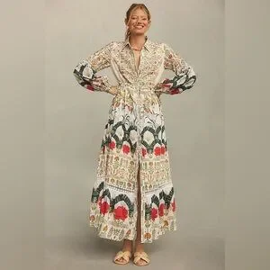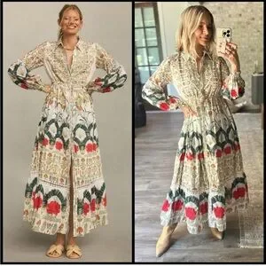 Anthropologie Button Down Eleanora Maxi ShirtDress Botanical Motif XL Needs TLC