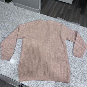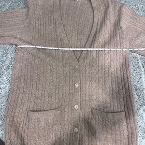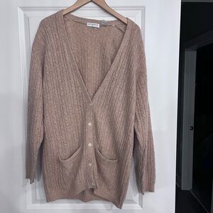 Elegant cable knit design. Soft and warm. Features front pockets and button closure.