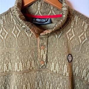 Olive sweater with intricate patterns. Long sleeves and comfortable fit.