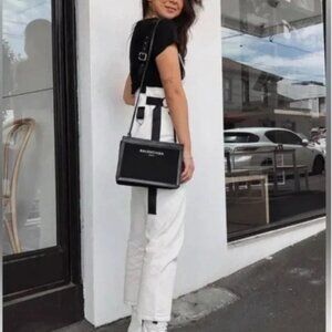 Trendy and versatile white and black overalls by Choosy. Features a flattering fit and modern design, perfect for dressing up or down. Brand new with tags attached.