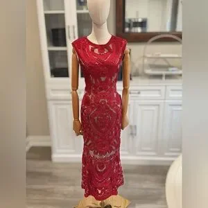 Brand new with tags! This jaw-dropping JS Collections Soutache Ribbon Embroidered Cocktail Dress features luxe red soutache ribbonwork over a nude mesh base for a sculptural, high-impact look. Elegant, curve-hugging, and perfect for cocktail events, weddings, or formal nights out.