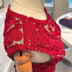 • Intricate red soutache embroidery on sheer illusion mesh