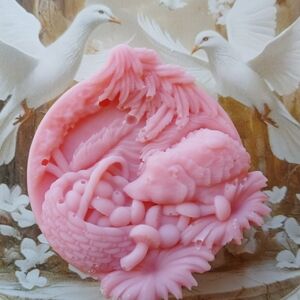 Beautiful pink soap featuring a detailed hedgehog and basket design. Perfect for adding a whimsical touch to your bathroom decor. Sandalwood scent.