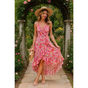 Vibrant floral wrap dress featuring a ruffled surplice neckline, adjustable side-tie waist, and a fluttery high-low hem that moves beautifully.