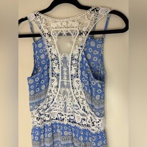 Chic maxi dress with intricate blue and white patterns. Sleeveless design with a flowing silhouette.