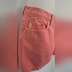 These Guess jean shorts boast a high-waisted design and a relaxed, casual cut, perfect for a laid-back look. The soft pink hue adds a unique flair to these classic denim shorts, making them a stylish choice for any casual outing.