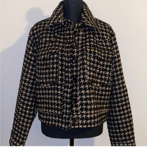Sophisticated houndstooth jacket by Avec Les Filles. Features a classic black and gold pattern. Ideal for stylish layering. Could fit S or M or L