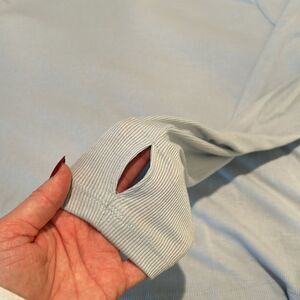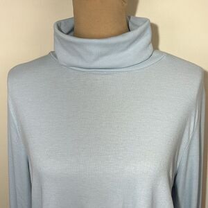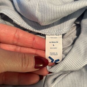 New with tags, smoke-free. Old Navy workout size large. Thin, ribbed turtleneck shirt. Measurements in the photos. Light blue, grayish color. Has thumb holes.