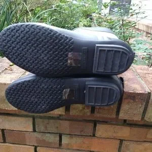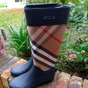Stylish Burberry rain boots. Classic plaid design. Durable and waterproof.