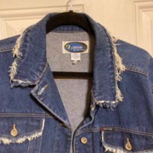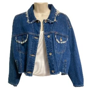 ON FIRE Street Wear Distressed Frayed Blue Denim Button Down Jacket Womens Large