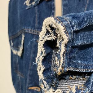 Intentionally distressed. Frayed pockets, collar and bottom hem