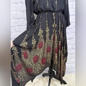 This bollywood style women's dress features a stunning black and red design with gold details, perfect for any occasion. The intricate patterns add a touch of boho sophistication and style. Pullover. Lined inside. About 47” length.
