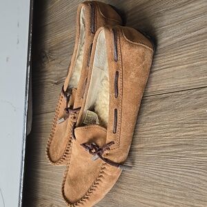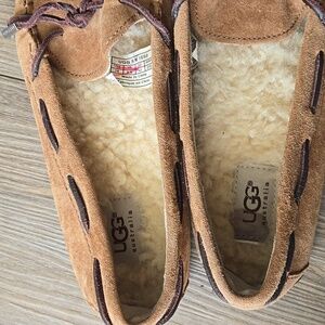 UGG Dakota Tie Bow Loafer in good preowned condition. Exterior is in great shape but interior lining in right shoe has soles.