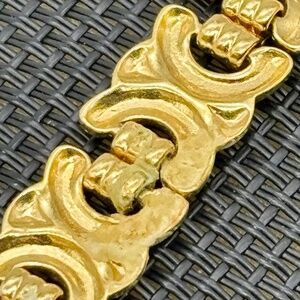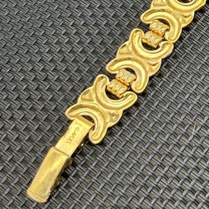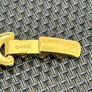 This beautiful vintage bracelet from Avon still retains a bright and shiny finish on the gold tone metal despite dating to the late 1980s. The measurements are 7 inches long, and 5/8 of an inch wide, and the piece closes with a fold over clasp, which is signed "Avon" on the underside. The bracelet is very lightweight, perfect for business casual to more formal affairs, and in very good condition.