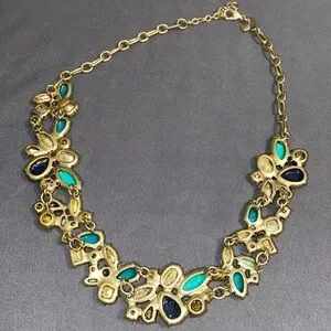Vibrant statement necklace with blue, green, and gold tones. Features a mix of gemstones and floral design.