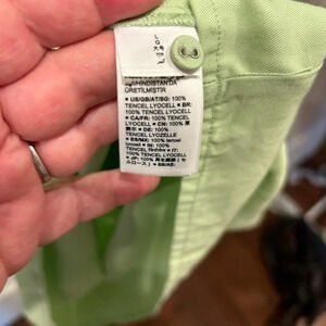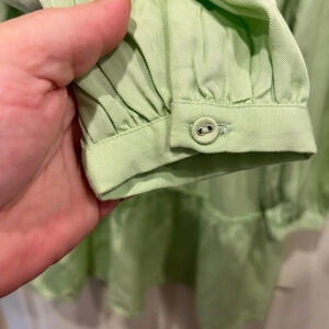 Euc. No flaws. Ruffled neck. Tie at the neck. Buttons at wrists. Stretchy waist. Tencel lyocell.