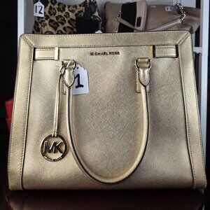 A stunning Michael Kors tote/satchel in a gold Saffiano-style leather. The small scratch on exterior hardware but otherwise in great shape, but the interior lining is flawed with makeup stains, a pen , and an ink stain.