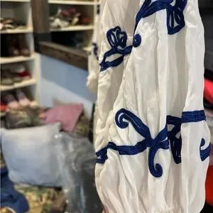 Chic white blouse with elegant blue embroidery. Features a gathered neckline and long sleeves. Ideal for stylish outings.
