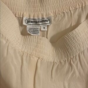 Lauren Alexandra 100% silk cream elastic waist pants. These elegant trousers offer a relaxed yet sophisticated silhouette, perfect for a variety of occasions. Their luxurious silk fabrication ensures comfort and a beautiful drape. Ideal for a chic daytime look or an elevated evening ensemble.