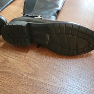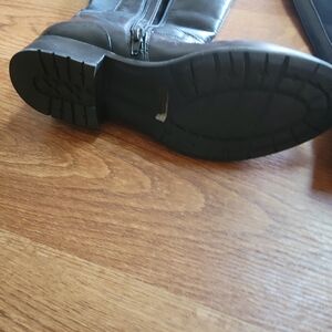 Step out in style with these sleek black knee-high boots. Perfect for any occasion, these boots offer both comfort and elegance. Clark's size 9.5 medium. Zippered, buckle accents. From a clean and smoke-free home.