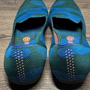 Elegant Rothy's loafers with a teal and navy knit pattern. Perfect for any occasion. Barely worn.