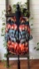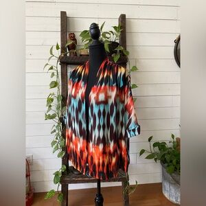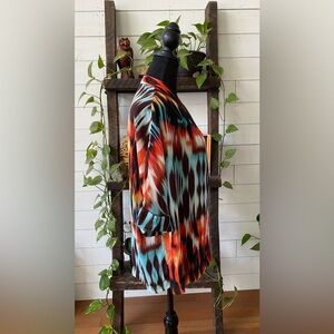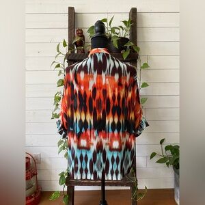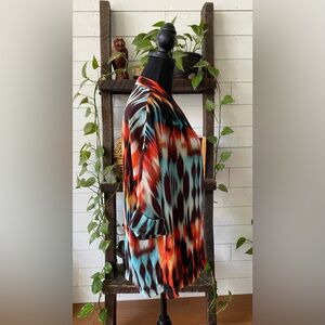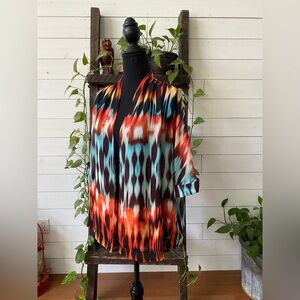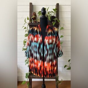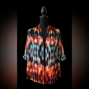 Bold kimono with striking multicolor pattern. Features vivid shades of red, blue, and black. Perfect for a standout look.