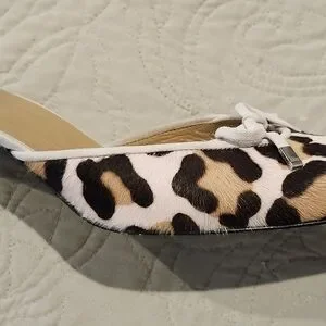 Chic mules with bold leopard design in pink, black & brown. Features a charming bow detail. Ideal for stylish outfits. Original price $475