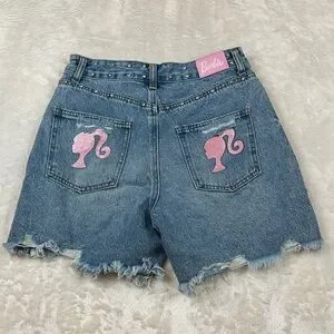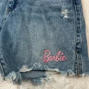 Stylish Barbie jean shorts in blue. Features pink logo and distressed details. Perfect for casual wear.