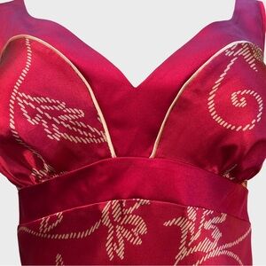 The rich crimson red satin features a subtle woven champagne vine motif, adding depth and quiet texture that catches the light. The bodice is thoughtfully constructed with contrast piping and contoured underbust shaping, offering natural structure and a sculpted fit — a dressmaker-level detail rarely found in simple slips.