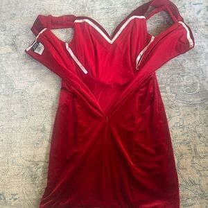 Chic red velvet mini dress by Jovani. Features an off-shoulder design. Perfect for elegant occasions during the holiday Christmas season. In excellent new condition.