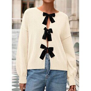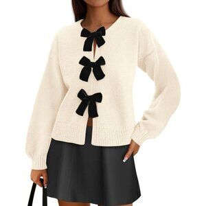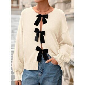 Features: This long sleeve cardigan has a cute bow tie front that adds a playful, elegant vibe. The relaxed crewneck and drop shoulder give it a modern, cozy fit that's flattering on all body types. Made with soft, stretchy fabric for all-day comfort.