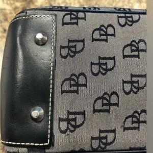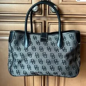 By Dooney and Bourke, this classic small two-handle tote will never go out of style. A beautiful black and gray co traditional pattern makes Ty is bag pop and goes with everything! It has silvertone hardware, constructed of leather and canvas.