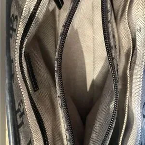 The bag has two large compartments separated by a center zip-up compartment. One side has two slip pockets and the other side has a zip pocket. There is also a key clip attached to interior with small leather strap.