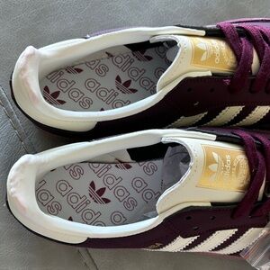 Stylish adidas Samba shoes. Maroon suede with white stripes. Comfortable and trendy.